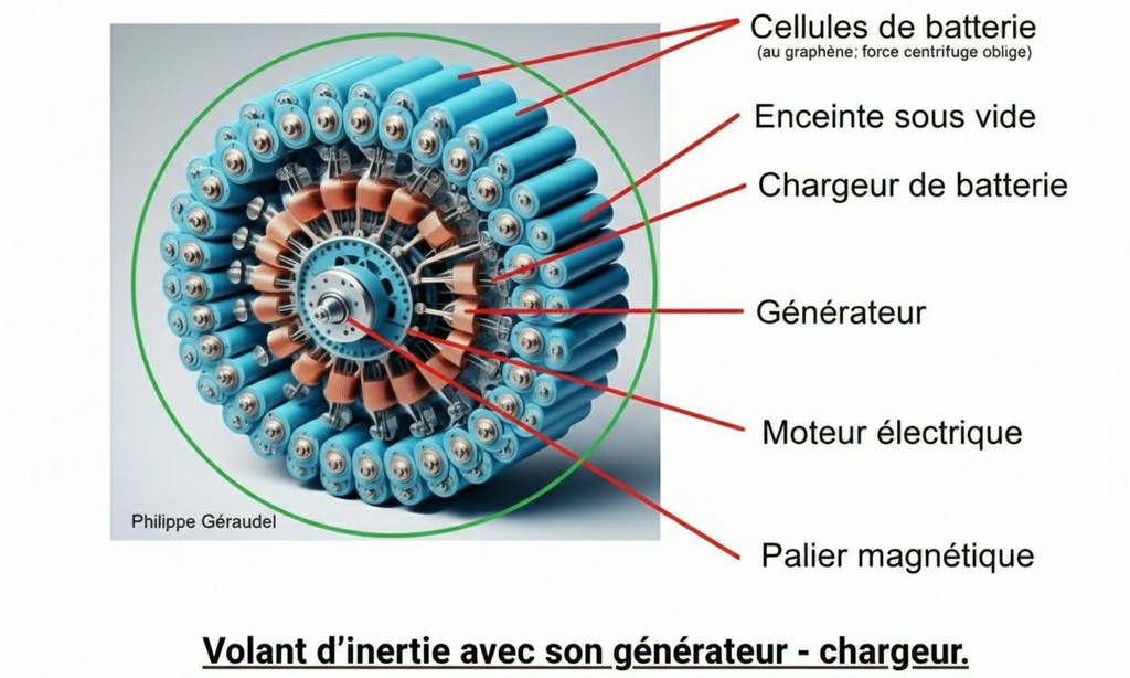 Le principe est simple : lors d’une décélération, l'énergie cinétique du véhicule est transférée vers un volant d'inertie dont la masse périphérique est constituée de cellules de batteries.