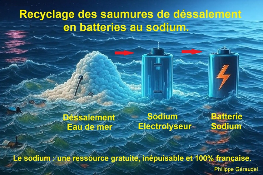 Plutôt que de perdre cette énergie, elle peut alimenter l'électrolyse du sodium extrait des saumures.