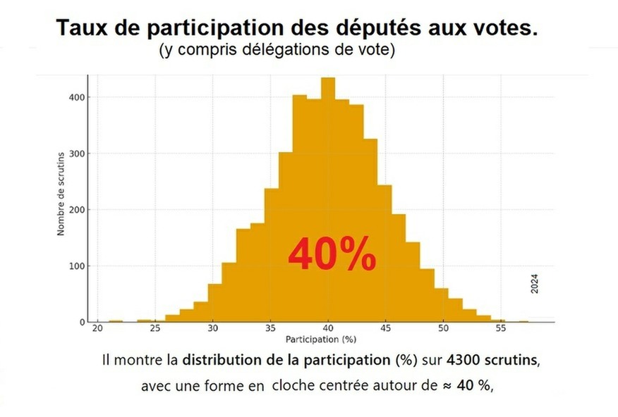 Plus grave encore : un calcul identique montre que le taux moyen de participation des députés aux votes à l'Assemblée plafonne à 40%.