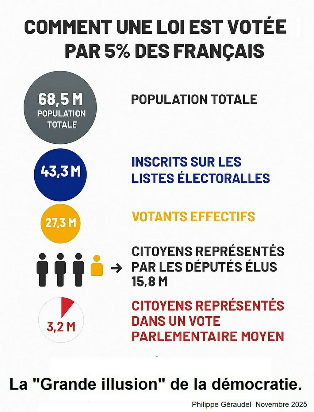 Au terme de ces filtres successifs (étrangers, mineurs, non inscrits, abstention, mode de scrutin, discipline de parti, faible présence aux votes), les lois adoptées par des élus ne représentent plus que 3 à 5 % de la population française .