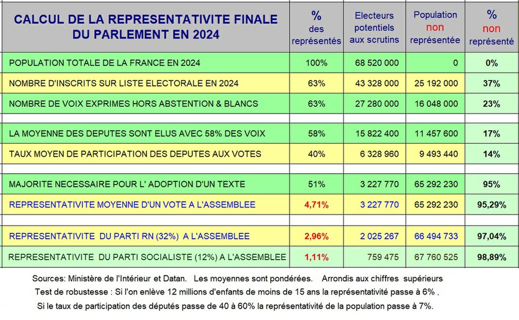 Au terme de ces filtres successifs (étrangers, mineurs, non inscrits, abstention, mode de scrutin, discipline de parti, faible présence aux votes), les lois adoptées par des élus ne représentent plus que 3 à 5 % de la population française .